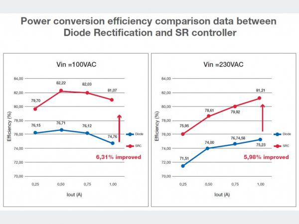 圖1:二極管整流和SR控制器之間的功率轉換效率數據比較 (圖片來源:ROHM)