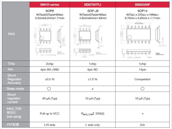 為了盡可能有效地滿足市場需求,ROHM開發了單通道和雙通道同步MOSFET控制器(圖2)。BD1R001xxF內置有兩枚芯片。BD87007FJ(一個通道)和BD85006F(兩個通道)內置有一枚芯片,可以實現兩種功能:SR控制器和并聯穩壓器。這些器件的封裝類型和規格概覽參見圖3。下文將介紹這些控制器的部分功能。