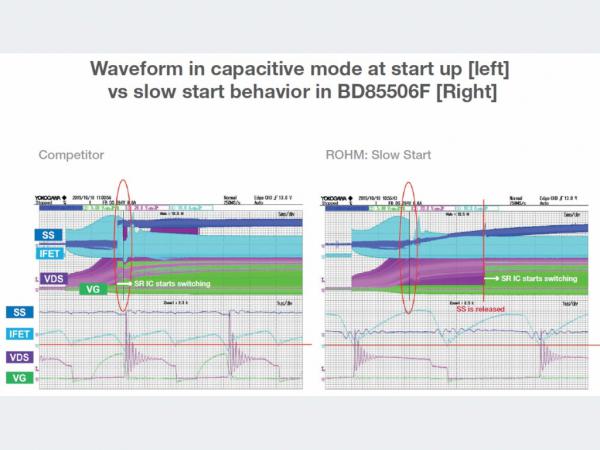 圖6:啟動時處于電容模式的波形[左]以及BD85506F的慢啟動行為[右](圖片來源:ROHM)