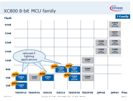 英飛凌推出適用于照明應用的微控制器。除了可控制多通道LED燈或模塊,該微控制器還可為照明系統帶來更多價值,例如調光、燈溫控制、與照明網絡連接。與照明網絡連接能確保實現日光調節、運動控制開關、統一遠程控制、HMI接口、維護監控、燈驗證等功能。