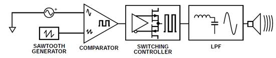 D類放大器可以簡單地描述為開關放大器或脈寬調制(PWM)放大器。下圖顯示了一個基本D類放大器的信號流程。
