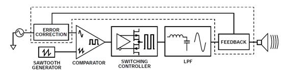 即使D類放大器具有高效率和高功率運行優勢,某些技術仍能改善音頻質量,例如使用反饋和預失真機制。下圖顯示了一個使用反饋機制的基本D類放大器。在反饋機制中,輸出信號(通常來自濾波器)被送至輸入端的誤差校正模塊。誤差校正模塊可以是全模擬式,或者采用數字處理故意使音頻信號預失真,從而校正輸出瑕疵并改善音頻輸出質量。除了?揚聲器的固有非線性之外,揚聲器阻抗因為溫度和老化而變化的趨向也可能引起這種瑕疵。