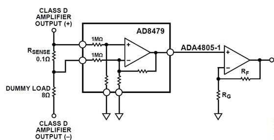 電流監控電路可以獲取要反饋的數據進行誤差校正。選擇適合這種用途的器件的挑戰在于:器件必須足夠魯棒以便接收音頻放大器輸出端的高壓脈沖。AD8479可以滿足這一要求,因為即使存在高輸入共模電壓,它也能工作。電路中還加入了ADA4805-1,作為低失調、低噪聲的模數轉換器(ADC)驅動器。