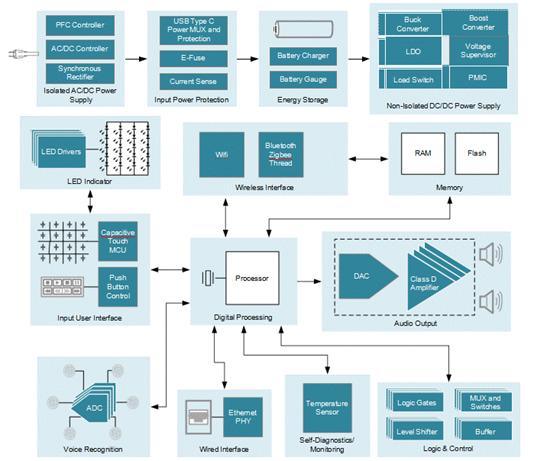 智能音箱需要大量電路才能實現其正常并良好地運行。要實現這一目標,我們便需要一系列復雜的模擬、數字、混合信號和電源管理子系統、接口等,并讓其實現互連(圖 2)。
