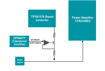 為了提高效率,您也可以根據內容動態調整放大器的輸出電源電壓。這種技術稱為包絡跟蹤。它僅在音樂 需要提高功率時跟蹤音頻內容并提高電壓(輸出功 率),特別是在重低音部分(信號內容中有許多峰值)。