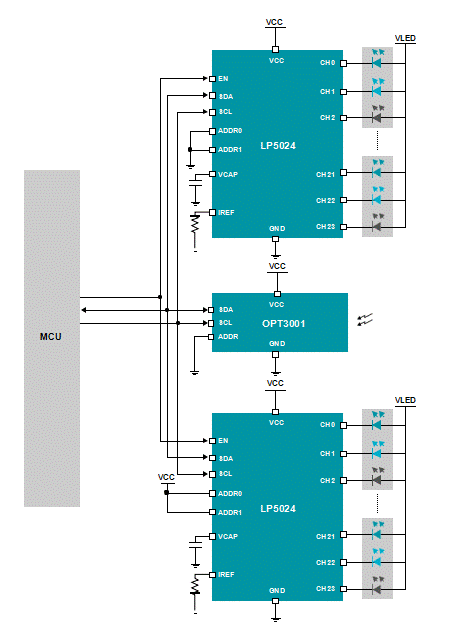 LED 基本用于指示狀態, 近也用于通過以各種圖案生成動態顏色來提高終端用戶體驗。較簡單的系統可能使用單色LED,但大部分系統使用紅、綠、藍 (RGB) LED。如果您選擇多色 LED,則需要確定使用多少個 RGB LED,以及系統處理器、MCU 或裝有集成式LED引擎的新型多LED 驅動器是否會控制它們。每種選擇均需權衡成本、電源和系統方面的考量。使用集成式LED 圖形引擎可以在處理器管理圖形生成時減輕其負擔,并在處理器或 MCU 進入低功耗待機模式時驅動RGB LED 陣列。