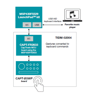 基于手勢的電容式觸控揚聲器界面參考設計(如圖 7 所示)提供了一種易于使用的評估系統,用于使用 TI 電容式觸控MCU 的智能揚聲器的多手勢電容式觸控界面。此設計支持點擊、輕滑、滑動和旋轉手勢。