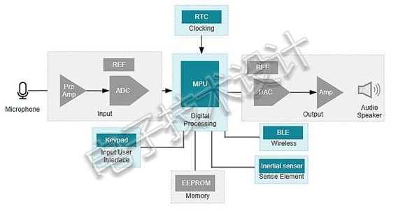 針對聽戴式裝置設計,類比電路透過麥克風轉換聲音,進行放大和調節后,再將其發送到微控制器(MCU),讓MCU進一步調節并過濾訊號,最后驅動微型揚聲器,將訊號傳送至耳膜;谖⑻幚韱卧∕PU)的數位處理可以促進背景雜音和聲學反饋消除,增強語音效果,并提供自動增益控制(AGC)。