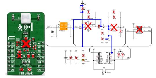 因此,使用此類MCU,可顯著減少PIR click的PCB布線工作。圖2展示了可以省去的元件(X)以及新的連接方式(藍色線條)。