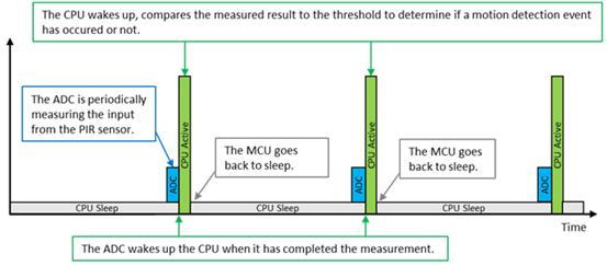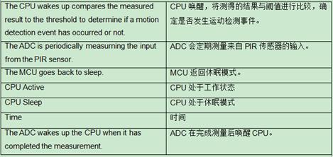由于MCU具有休眠模式并且可快速喚醒,每個傳感器節點的功耗都可以達到非常低的水平。節點可以休眠,當在傳感器檢測范圍內出現溫度變化并由此檢測到運動時,節點就會快速喚醒,并在完成信號處理后返回休眠模式。因此,能夠延長每個電池供電節點的工作時間,而無需更換電池。請參見圖4,了解使用休眠模式和快速喚醒時CPU的運行方式。功耗取決于具體應用,并且會根據PIR傳感器的配置、采樣時間和濾波參數而有所不同,這些因素也會影響傳感器的檢測范圍和/或靈敏度。若應用需要達到更低的功耗,可以對這些參數進行調整,進一步降低功耗。
