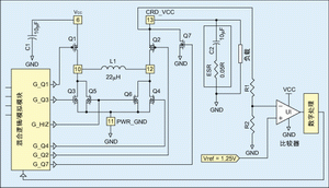 周期2:Q2及Q3開通,且存儲在電感L1中的能量通過Q2轉移到外接負載。在此階段,Q1/Q4及Q5/Q6關斷。電流流通周期是900ns恒定值(典型值),如果CRD_VCC電壓低于規定值,在這段時間以后重復周期1。
