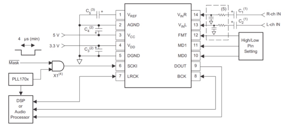 ADC輸入是單端而且內部通過20kΩ電阻偏置在共模電壓(50%*VCC)(典型@fs=48kHz)。輸入信號范圍隨著電源電壓擴張,正常情況為 0.6*VCC Vpp(典型)。ADC 輸出數據格式是二進制的補碼。內部高通濾波器消除直流失調電壓。