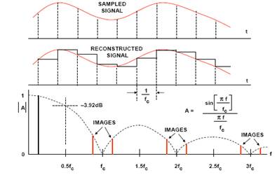 請注意,在奈奎斯特頻率fc/2,重構(gòu)信號幅度降低3.92 dB。如果需要,可以使用一個反sin(x)/x濾波器來補(bǔ)償此效應(yīng);ㄐ盘柕溺R像作為采樣函數(shù)的結(jié)果出現(xiàn),并且也通過sin(x)/x函數(shù)衰減。