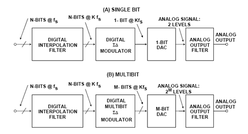 Σ-Δ型DAC可以使用多位,這就是圖5B所示的“多位”架構(gòu),其原理與之前討論的插值DAC相似,不過增加了Σ-Δ型數(shù)字調(diào)制器。