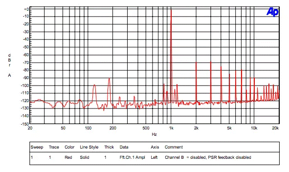 4.在僅打開通道A PWM輸出的情況下,使用模擬分析儀(例如Audio Precision),對通道A進行幅度與頻率的FFT。1 kHz音調應具有-1 dBFS的幅度。圖1顯示了僅啟用一個通道A作為基線的結果。