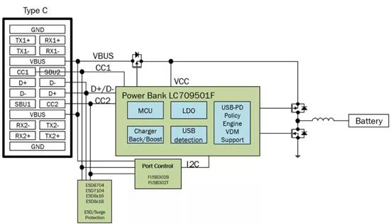 為了支持PD的所有功能,包括使用VDM的快速充電,移動電源制造商將需要轉(zhuǎn)向設(shè)計(jì)一個(gè)智能控制器來提供通過USB PD提供的功能。例如安森美半導(dǎo)體的LC709501F。這高度集成的基于Flash的可配置設(shè)備匯集了所需的所有功能,通過多個(gè)USB接口管理鋰離子電池提供的電源。圖2所示為一個(gè)典型的應(yīng)用示例。