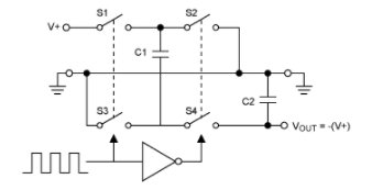 閉合S1和S3會在前半個周期將飛跨電容器C1充電至V +。在下半部分,S1和S3打開,S2和S4關閉。此動作將C1的正極連接到地,并將負極連接到VOUT。C1然后與儲能電容器C2并聯。如果C2兩端的電壓小于C1兩端,則電荷從C1流到C2,直到C2兩端的電壓達到-(V +)。