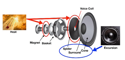 揚聲器的第二個問題是,當電流通過音圈時,一些能量會轉化為熱量而不是聲音。用力推揚聲器,這種加熱可能會熔化電磁線上的清漆,從而損壞音圈。當音圈從放大器傳遞的能量中加熱時,音圈必須通過磁鐵冷卻到周圍的結構中。在傳統的放大器中,最大功率被限制在一個值,如果連續提供,則不會損壞揚聲器。該最大功率值必須涵蓋所有揚聲器變化,工作條件和信號。因此,此值通常低于揚聲器可以處理的值,因此比較保守。