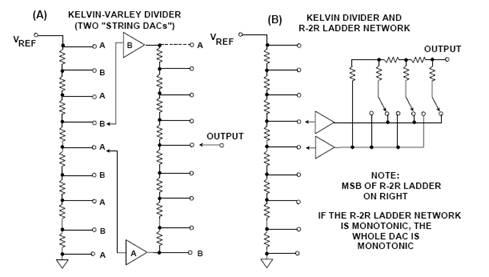 當然,緩沖放大器具有失調,這可能會在緩沖分段串DAC中造成非單調性。在緩沖Kelvin-Varley分壓器緩沖器的更簡單配置中(圖1A),緩沖器A總是“低于”(電位低于)緩沖器B,LSB串DAC上標“A”的額外抽頭是不必要的。數據解碼電路僅為兩個優先級編碼器。然而,在此配置中,緩沖器失調可能會造成非單調性。