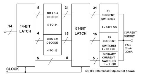 前5位(MSB)為完全解碼型,驅動31個同等權重的電流開關,各開關提供512 LSB的電流。后續4位解碼為15條線,驅動15個電流開關,各開關提供32 LSB的電流。最后5個LSB位被鎖存,并驅動一個傳統二進制加權DAC,該DAC針對每個輸出電平提供1 LSB。為了實現這種超低毛刺架構,總共需要51個電流開關和鎖存器。