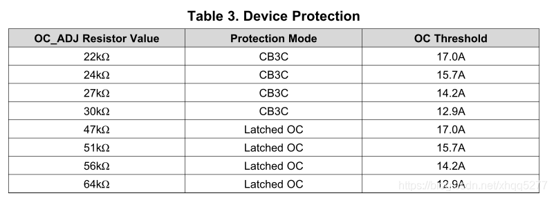 2. 確定系統功率,設計限流閾值: 通過OC_ADJ引腳串聯電阻設定: