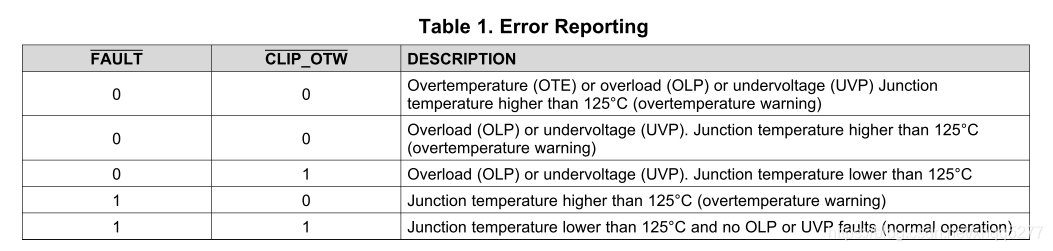 無論什么原因導致的無輸出,FAULT都會是“0”狀態; 當結溫超過125℃時,CLIP_OTW置”0“狀態,如結溫繼續上升到155℃時,FAULT置“0”狀態,并關斷輸出, "OTE"被使能,輸出關斷鎖定,必須重新復位才能啟動; 所以一個好的設計應該是這樣:檢測CLIP_OTW的狀態,當CLIP_OTW置“0”時,系統相應減小音量,以防激活“OTE”