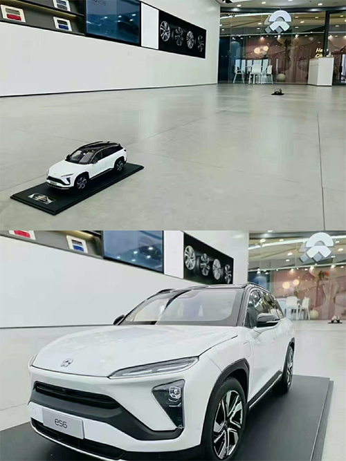 在四川省樂山市和眉山市的某家蔚來展廳,由于展車全部賣光,蔚來的銷售人員只得在展廳內擺放蔚來的汽車模型來給顧客介紹車輛。