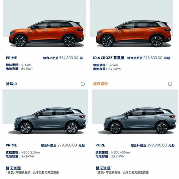 個月,不同的車型交付的時間有一定差別。值得注意的是,ID.4 CROZZ 的最低配和最高配車型均顯示受芯片等因素影響,此車型暫無預訂資源。