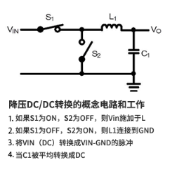 降壓DC/DC轉換是借著開關將DC電壓VIN做時間分割后以電感和電容器使其平滑化來轉換成所希望的DC電壓。降壓DC/DC轉換的概念電路和工作如右所示。