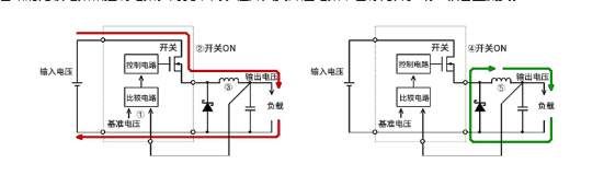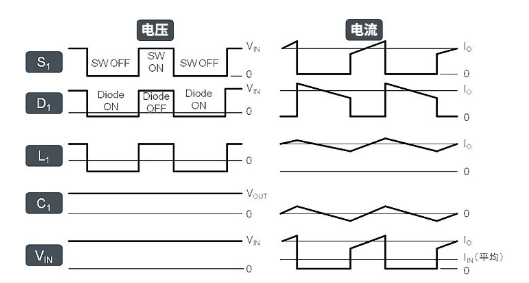 與基準電壓進行比較,檢查輸出電壓是否為設定電壓低于設定電壓時,開關變為ON,從輸入向輸出供電。此時,電感會蓄積磁能,如果輸出電壓高于設定電壓,則開關OFF電感所蓄積的磁能變為電流被供往輸出負載,再返回電感電感的磁能消失,輸出電壓開始下降時,開關會再度為ON實際電流及電壓的開關波形也有記載。S1為MOSFET的開關晶體管、D1為肖特基二極管、L1為電感、C1為輸出電壓、VIN為輸入電壓。