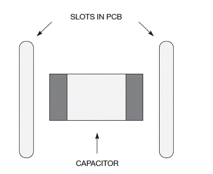 添加第二個電容器會增加成本,但不及將噪聲電容器替換為可能不會產生噪聲的電容器要多。Digi-Key的陶瓷電容器售價約為27美分(1000)。Kemet的KPS系列靜音部件的價格約為1.50美元。第二種方法涉及在PCB的電容器兩端附近制作一個插槽(圖2)。當電容器膨脹和收縮時,它僅使PCB的一小部分彎曲,這將減少噪聲。
