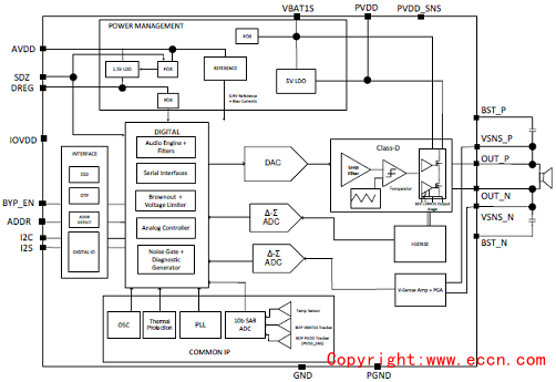 Up to eight devices can share a common bus via I2S/TDM and I2C interfaces. The device is available in a30-ball, 0.4 mm pitch CSP for a compact PCB footprint.