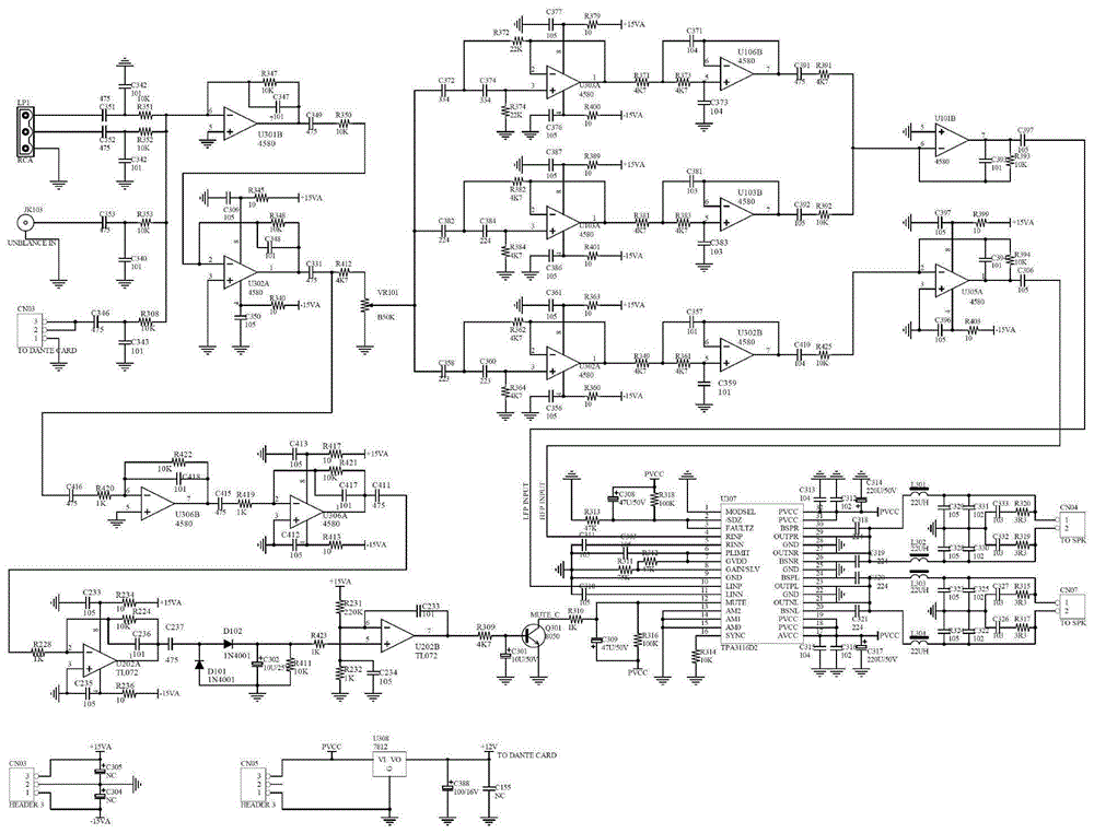 所述運放u306b的正相輸入引腳5接地,反相輸入引腳6通過串聯的電阻r420和電容c416接音頻輸入電路的輸出端,并通過并聯的電阻r422和電容c418接運放u306b的輸出引腳7,所述運放u306b的輸出引腳7通過串聯的電容c415和電阻r419接運放u306a的反相輸入引腳2,