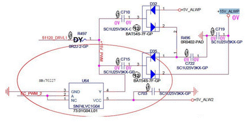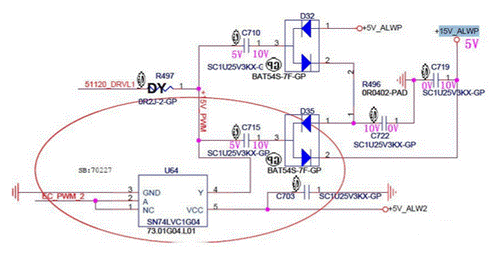 當通電時,右上角 5V_ALWP通過D32的1引腳對C710、C722、C715、C719進行充電,此時電容上兩端的電位如上圖所示。此時 15V_ALWP輸出端口的實際電平為5V。