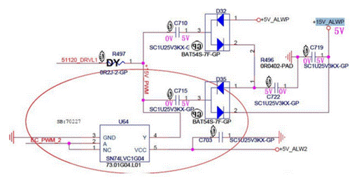 1.由于電容兩端的電壓不能突變,此時C715兩端的電壓為左邊5V,右邊為10V,然后電流經過D35的2引腳對C719電容充電,充完電后C719的電壓升到了10V。