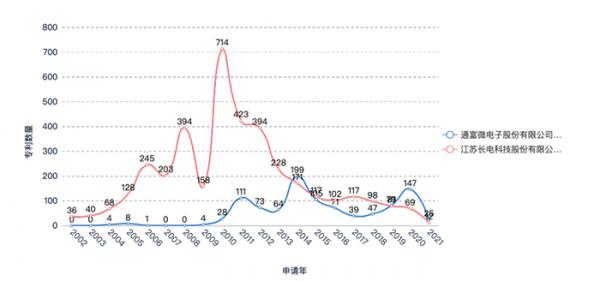 而通富微電起步較晚,直至2004年才開始申請專利,后勁力也略顯不足,僅2011年、2014年、2015年、2017年以及2020年專利申請量高于100項。因此,在2002至2013年期間,長電科技在專利申請量遠超通富微電,隨后二者專利申請量交替領(lǐng)先。
