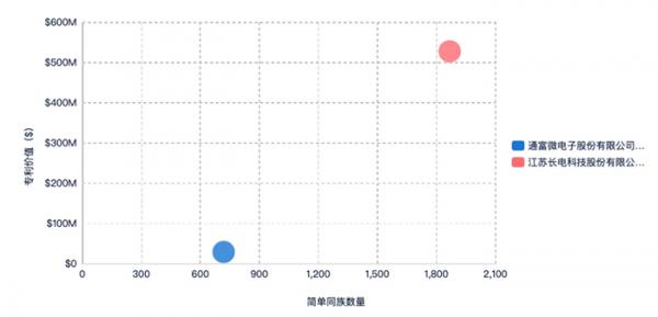 從專利價值來看,長電科技的專利總價值超過5億美元,通富微電的專利總價值低于1億美元,長電科技專利總價值顯著高于通富微電。