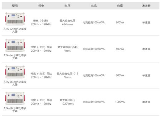 AigtekATA-L系列水聲功率放大器最大輸出功率1000VA ,輸出電壓1020Vrms ,高達200Hz ~ 120kHz,可驅動0~100%的阻性或非阻性負載。
