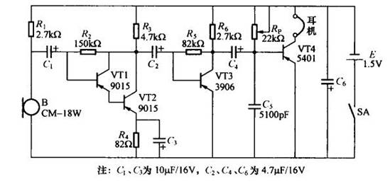 圖1中R2、R3、R4是VT1、VT2的直流偏置電阻,R5、R6是VT3的直流偏置電阻,RP和耳機內阻是VT4的直流偏置電阻,如果其中任一電阻損壞,均會使對應三極管的靜態工作點發生變化,使放大電路出現信號失真,C1、C2、C4分別是三級放大電路耦合電容,是交流信號的必經之路,如果其中有一電容損壞,均會使放大電路出現無聲或音小的故障。