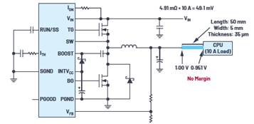 在這些數字系統中,有很多都使用高電流和低電壓,因此更需要盡可能縮短電源和負載之間的距離。高電流導致的一個明顯問題是,從轉換器到負載,線路產生的電壓會不斷下降。圖1和圖2顯示了電源和負載之間引線電阻的最小化如何使轉換器的輸出電壓降最小化——本例中是控制器IC和為CPU供電的MOSFET。