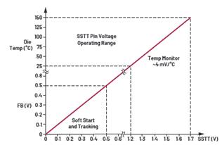 在上述解決方案中,LTC3310S內部溫度升幅通過高效率操作而得以最小化,即使在CPU、SoC和FPGA等高功耗器件周圍的惡劣溫度條件下,它也能夠可靠地運行。此外,LTC3310S內置精密溫度傳感器,支持通過SSTT引腳測量內部結溫,如圖10所示,相應的溫度傳感器特性如圖11所示。