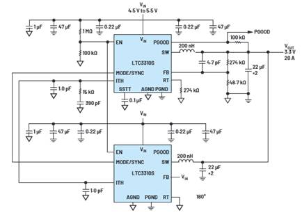 某些單片穩壓器可通過多相并聯操作擴展到更高負載應用。圖12顯示了多個LTC3310S器件并聯并錯相工作,使得電流能力加倍。
