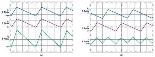 圖13.比較兩個版本的雙通道轉換器的電感電流和輸出電流:(a) 同相通道與 (b) 反相通道