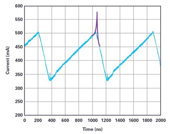 圖3顯示了通過與所用示波器兼容的電流探頭檢測到的開關電源的電感電流(藍色)的測量結果。除了顯示為藍色的測量結果之外,還添加了紫色標記,它指示當電感開始接近峰值電流進入過度飽和時,流過電感的電流狀況。當選擇的電感對于給定的應用不能提供足夠的額定電流時,就會發生這種情況。在開關電源中進行電感電流測量的主要原因之一是,它可以幫助識別是否正確選擇了電感,或者在工作中或故障情況下是否會出現電感飽和。