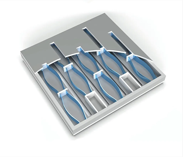 微型揚聲器的內部是一個微小的柔性光束陣列,每個光束的長度只有20微米。當音頻信號的電壓被施加到該設備上時,它使這些光束反復向彼此彎曲。當它們這樣做時,它們迫使空氣從設備的頂部和底部的小開口中流出。被抽出的空氣在耳朵里產生壓力波動,被感知為聲音。