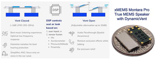 xMEMS Labs(美商知微電子)今日宣布推出集成DynamicVent的單芯片MEMS揚聲器Montara Pro,結合開放式和封閉式的耳塞式耳機的優點,使智能TWS(真無線藍牙)耳塞式耳機和助聽器能創造出兩全其美的用戶體驗。在本周于拉斯維加斯舉辦的CES消費電子展上,xMEMS在Venetian Suite 29-325首次展示Montara Pro。