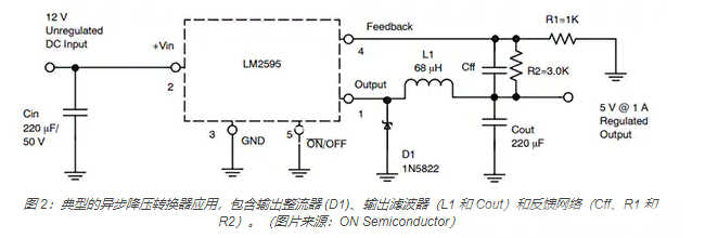 典型的異步降壓轉換器應用如圖 2 所示。ON Semiconductor 的 LM2595 是一款單片集成電路,包括主電源開關和控制電路。該器件采用內部補償,最大限度地減少了外部元器件的數量并簡化了電源設計。其典型轉換效率為 81%,發熱損耗為占功率的 19%,而同步降壓方案的典型轉換效率約 90%,發熱損耗僅占功率的 10%。這意味著異步降壓轉換器的熱損耗幾乎是同步降壓轉換器的兩倍。因此,使用同步降壓轉換器可以減少發熱,從而大大簡化熱管理難題。