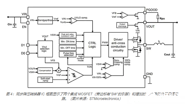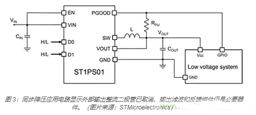 在同步降壓轉換器中,如 STMicroelectronics 推出的 ST1PS01 使用同步 MOSFET 整流取代了輸出整流器(圖 3)。相比異步降壓轉換器中的輸出整流器,同步 MOSFET 的“導通”電阻較低,可降低損耗,從而顯著提高轉換效率。同步 MOSFET 是該 IC 的內部組成部分,不需要外部整流二極管