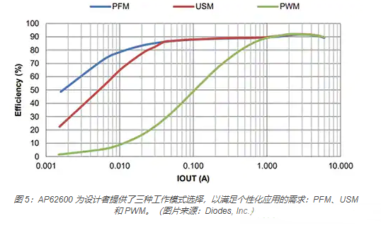 AP62600 提供了三種操作模式供設計者選擇,以滿足個性化應用的具體需求(圖 5)。通過脈沖調頻 (PFM) 操作,可以實現所有負載的高效率。其他可用的模式包括可以獲得最佳紋波性能的脈寬調制 (PWM),以及可避免輕載時產生可聞噪聲的超聲波模式 (USM)。