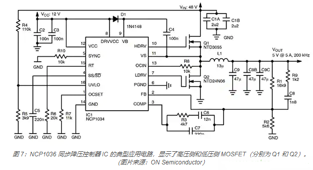 ON Semiconductor 的 NCP1034DR2G 是一款高壓 PWM 控制器,針對輸入電壓高達 100 伏的高性能同步降壓 DC/DC 應用。該器件設計用于嵌入式電信、網絡和計算應用中的 48 伏非隔離電源轉換。NCP1034 驅動一對外部 N 溝道 MOSFET,如圖 7 所示。